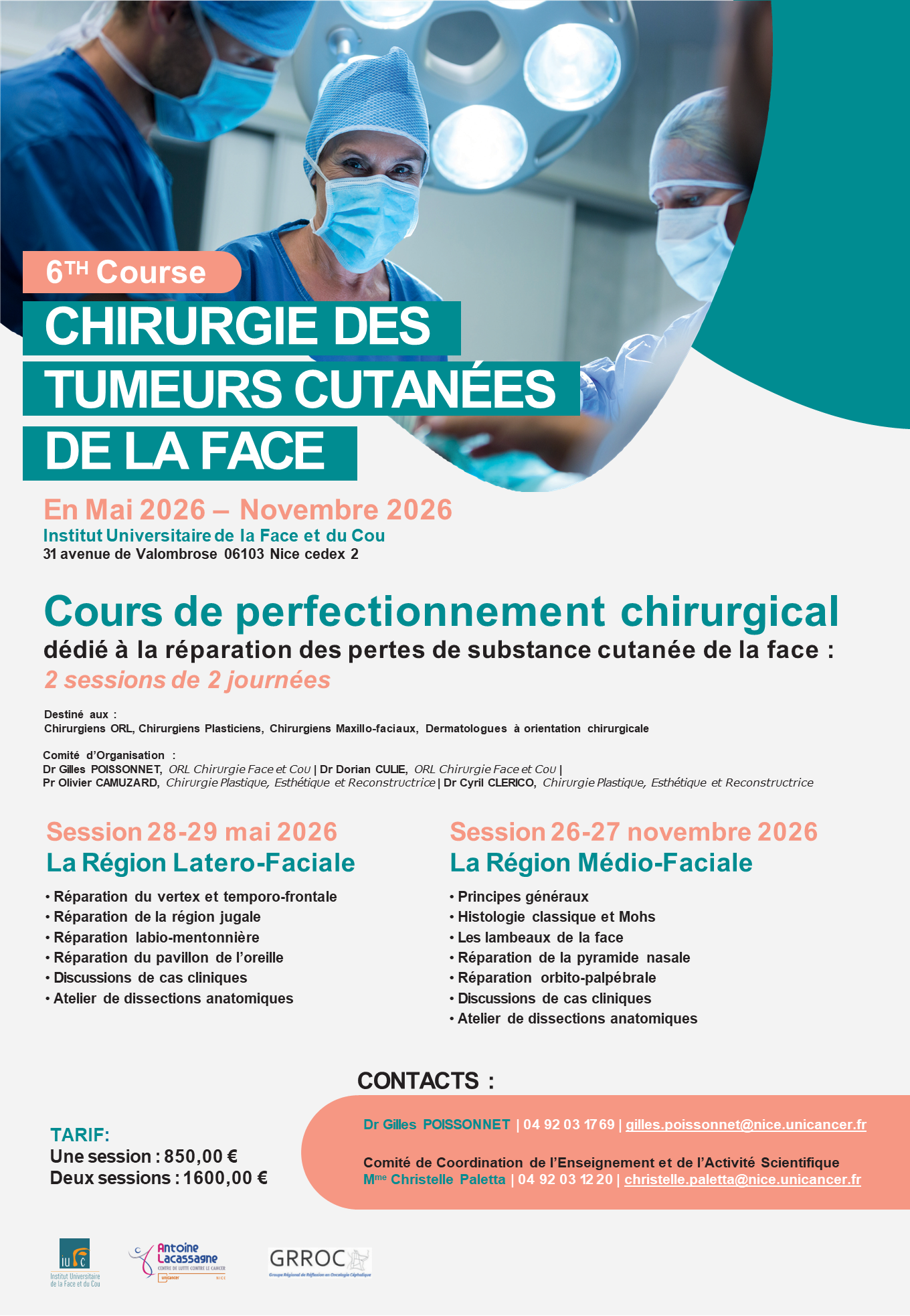 Ce cours dédié à la réparation des pertes de substance cutanées de la face sera réalisé à l’Institut Universitaire de la Face et du Cou à Nice. Il a pour but l’apprentissage et le perfectionnement de tous les procédés et lambeaux utilisés en chirurgie réparatrice des tumeurs cutanées de la face. Grâce à des conférences interactives, de nombreux cas cliniques et des vidéos, toutes les localisations des pertes de substance de la région céphalique seront abordées de façon exhaustive.